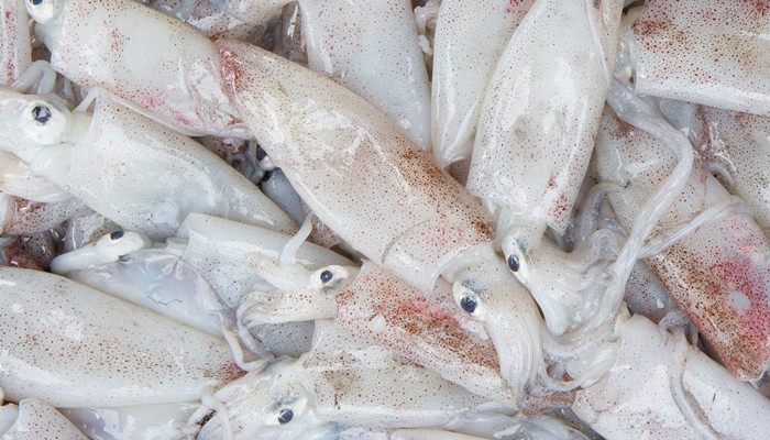 鱿鱼,也称柔鱼、枪乌贼,是软体动物门头足纲鞘亚纲十腕总目管鱿目开眼亚目的动物。体圆锥形,体色苍白,有淡褐色斑,头大,前方生有触足10条,尾端的肉鳍呈三角形,常成群游弋于深约20米的海洋中。
