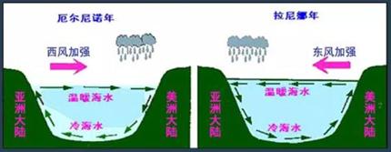 太平洋上空的大气环流叫做沃克环流,当沃克环流变弱时,海水吹不到西部,太平洋东部海水变暖,就是厄尔尼诺现象;但当沃克环流变得异常强烈,就产生拉尼娜现象。一般拉尼娜现象会随着厄尔尼诺现象而来,出现厄尔尼诺现象的第二年,都会出现拉尼娜现象,有时拉尼娜现象会持续两、三年。
