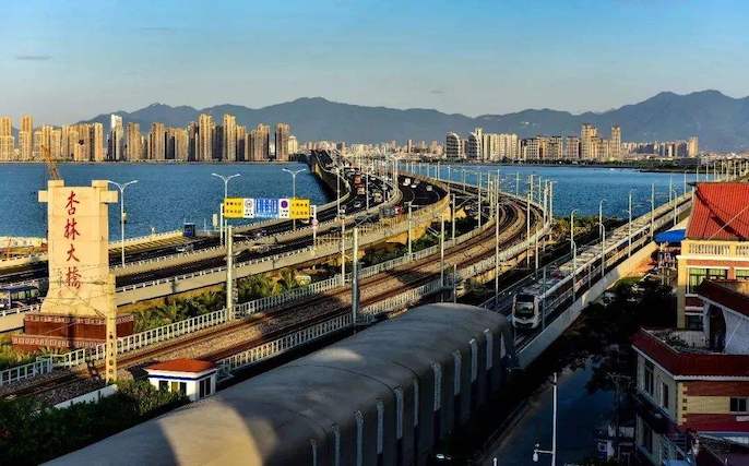 杏林大桥是厦门市连接集美区与湖里区的跨海通道,位于厦门北海域之上;杏林大桥西起杏林互通立交,上跨厦门北海域,东至高崎互通立交;公路桥为双向六车道城市快速路,设计速度为80千米/小时;铁路桥为双线铁路,设计速度为200千米/小时。
